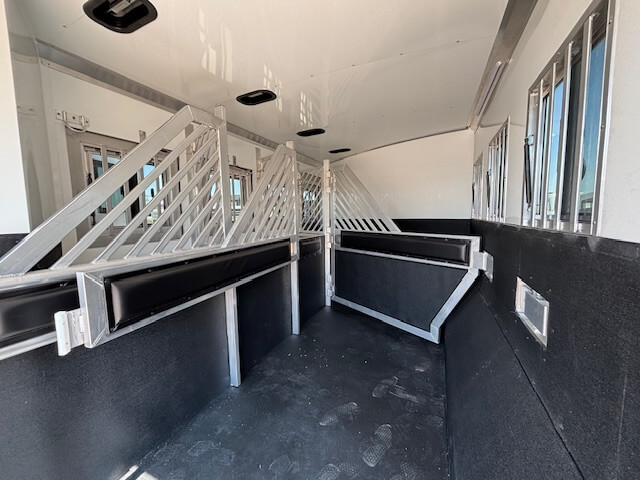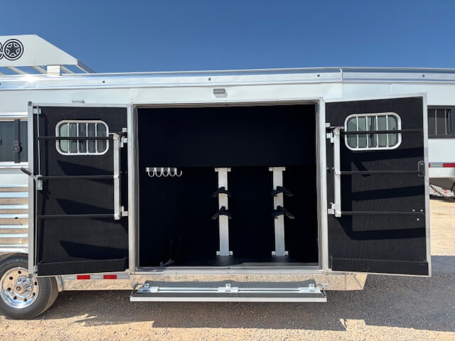 #702 8x21x7'6 Tall. 2026 Bloomer 4 Horse Smart Tack Trainer Deluxe. Dressing Room with Boot Bench, Shelves, Bridle Hooks, Side Rear Broom Closet with Extra Hooks and Shelf, Side Tack with 4 Saddle Racks, Swing Out Blanket Bars, Bridle Hooks, Lined and Insulated Horse Area, Mangers, Escape Door, Stud Divider, Rear Ramp, Solar Panel, Hydraulic Jack, Hay Rack, Spare Tire...