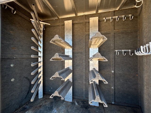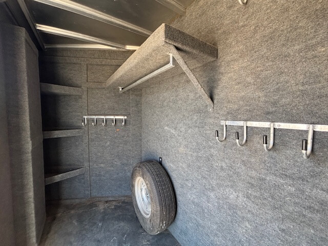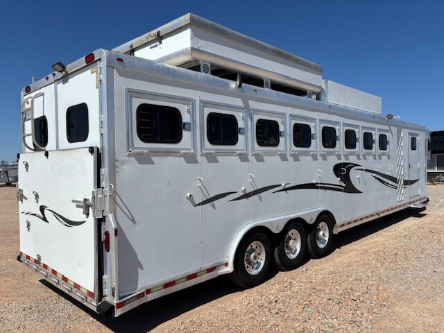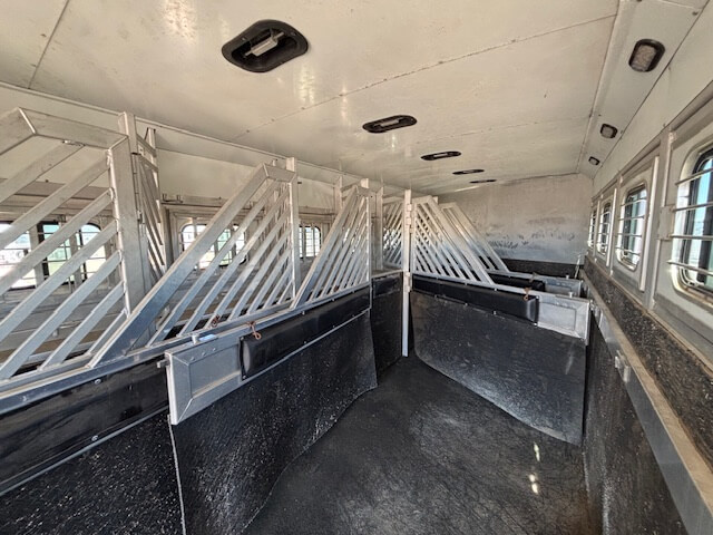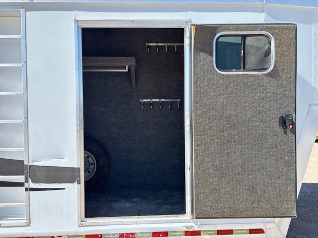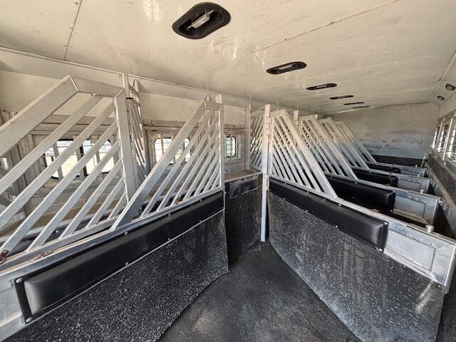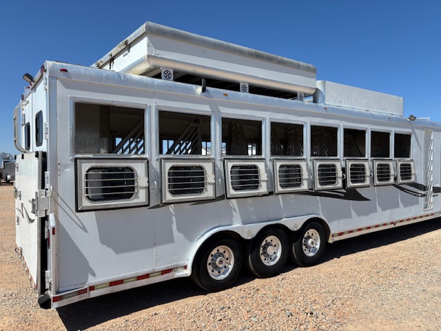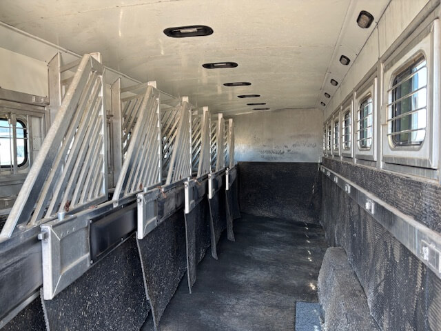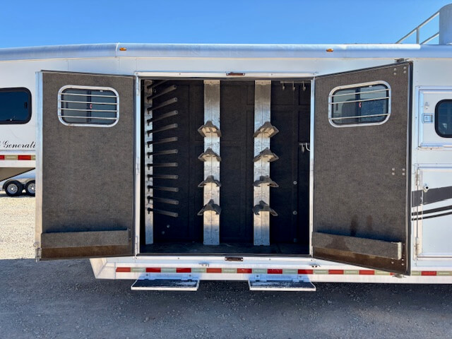 #51187 8x35x7'6 Tall. 2006 Bloomer 8 Horse Trainer Plus. Smart Tack with 8 Saddle Racks, Hooks Galore, Brush Boxes and Blanket Bars, Dressing Room with Boot Bench, Shelves & Extra Hooks, Additional Side Tack/Broom Closet, Insulated Horse Area, Rubber Lined Walls, Roof Vents, WERM Floor, Rear Ramp, Drop Windows on Both Sides, Mangers, Hay Rack + Hay Pod, Hydraulic Jack, Three 7k Axles, Spare Tire...