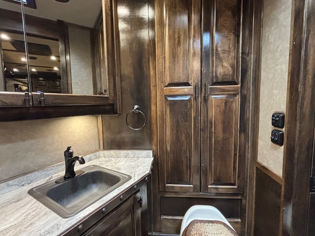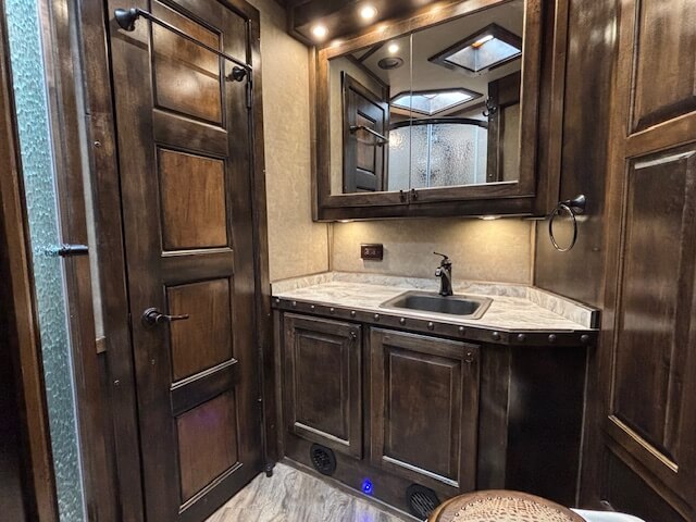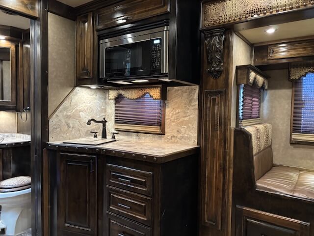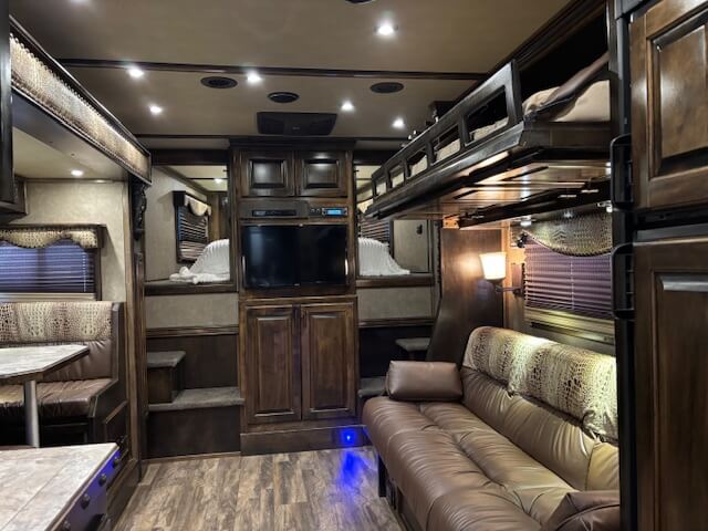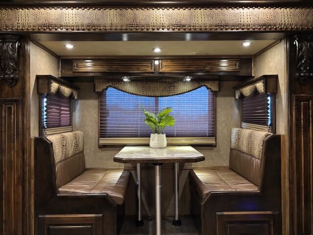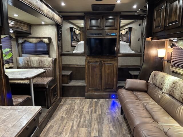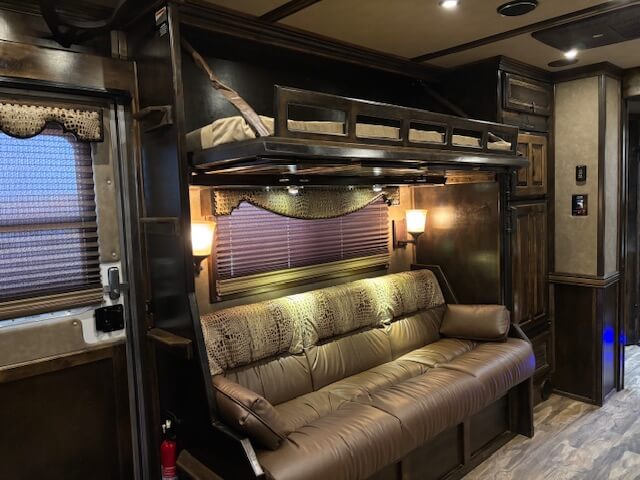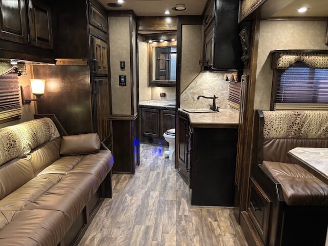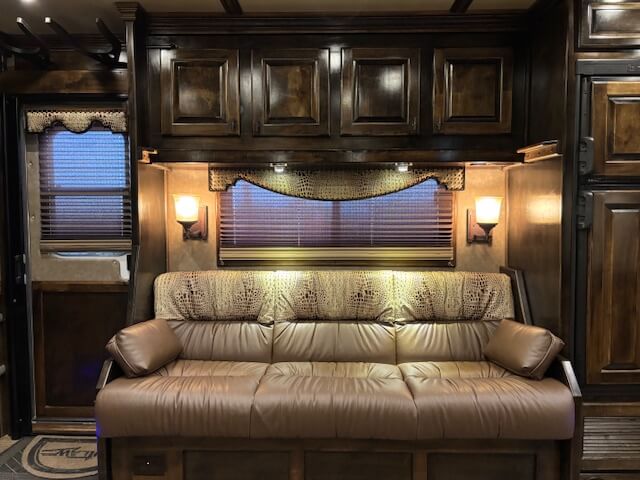 #11774 8x37x7.5 Tall. 2019 Cimarron 4 Horse Side Load 17' Outlaw Conversion. Dinette in Slide, Full Kitchen, 6.0 Fridge, Couch with Fold Down Bunk Overhead, Large Bathroom with Walk in Closet, Integrated Hay Pod, GENERATOR (1238 Hours), Full Back Tack, Swing Out Saddle Racks, Shelves Galore, Side Ramp, Mangers, Drop Windows on Both Sides, Stud Divider, Equiflex Floor, Armless Awning for Horses, Three 8k Axles, Air Ride, Elec/Hydraulic Brakes, Enclosed Nose, Dual Hydraulic Jacks...