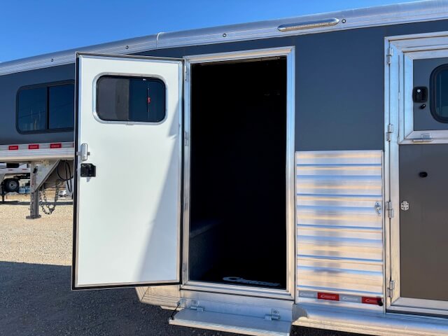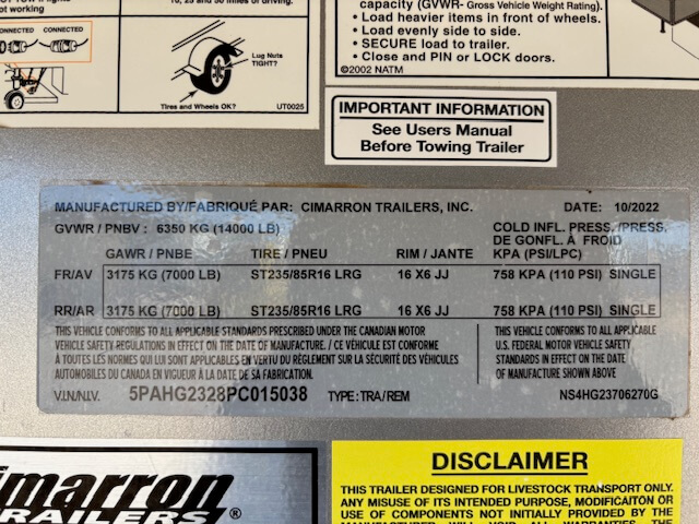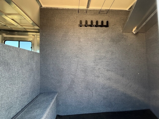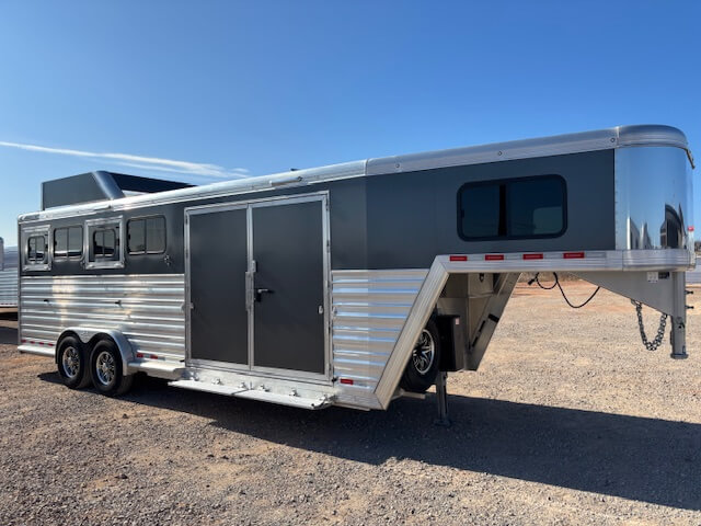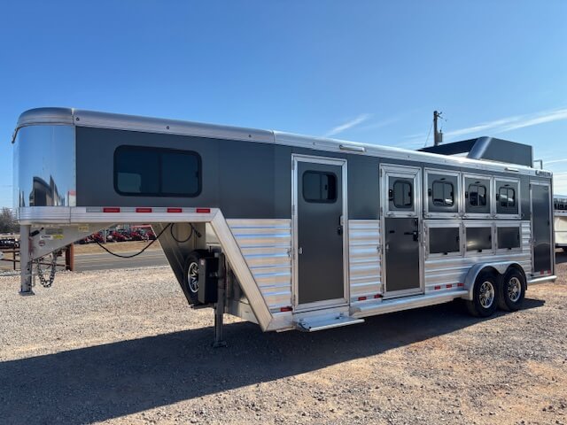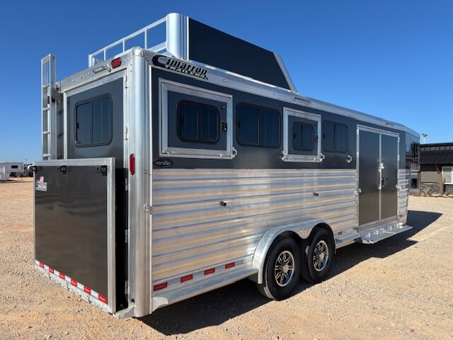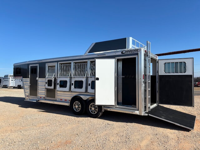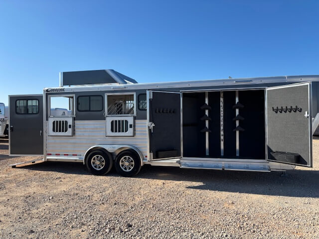 #15038 7.5x23x7 Tall. 2023 Cimarron 4 Horse Trainer Trailer. Side Tack with 6 Saddle Racks, Extra Hooks, Blanket Bars, Brush Trays, Dressing Room with Boot Bench, Shelf and Clothes Rod, Broom Closet, Lined and Insulated Horse Area, WERM Floor, Two Stud Dividers, Mangers, Drop Windows on Both Sides, Hay Rack/ Ladder, Rear Ramp, Hydraulic Jack, Spare Tire...