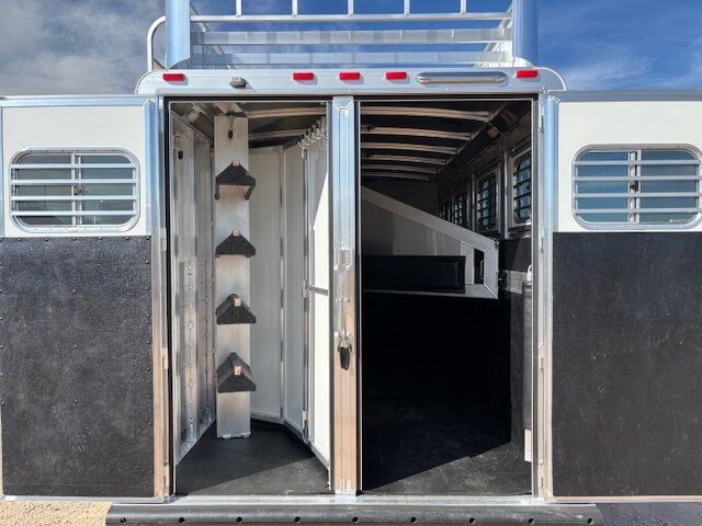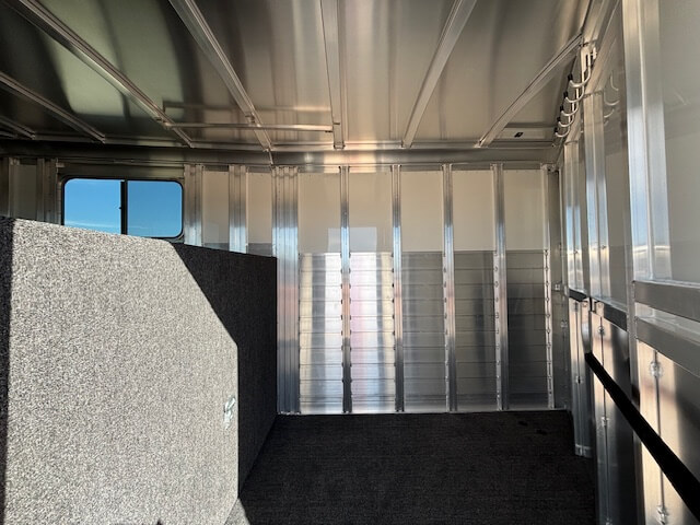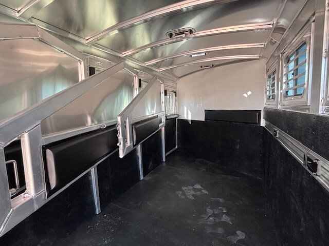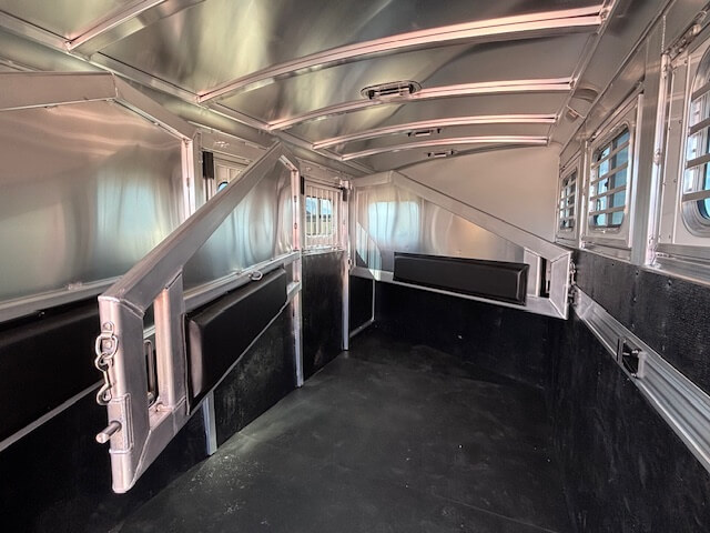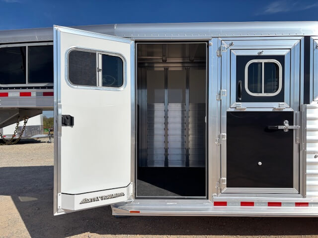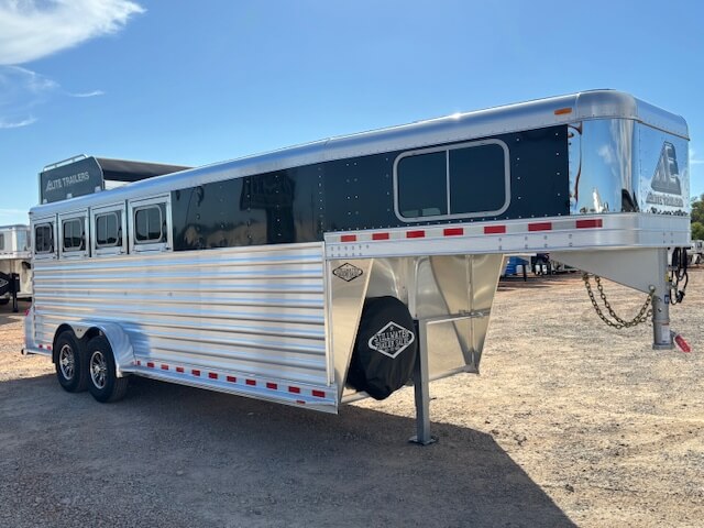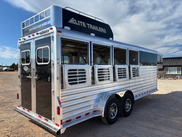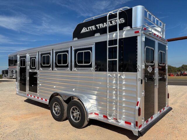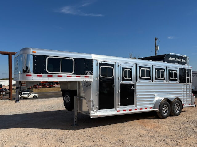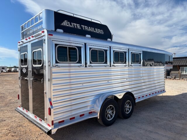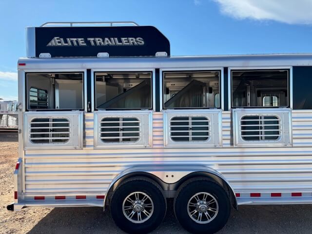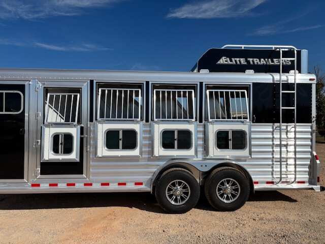 #23419 7x21x7 Tall. 2026 Elite 4 Horse Mustang. Black Skin, Dressing Room with Blanket Bars & Bridle Hooks, Collapsible Rear Tack, Rubber Lined Horse Area, Drop Windows on Both Sides, Escape Door, Hay Rack & Ladder, Aluminum Wheels, Spare Tire...