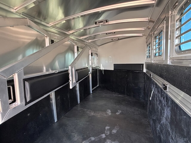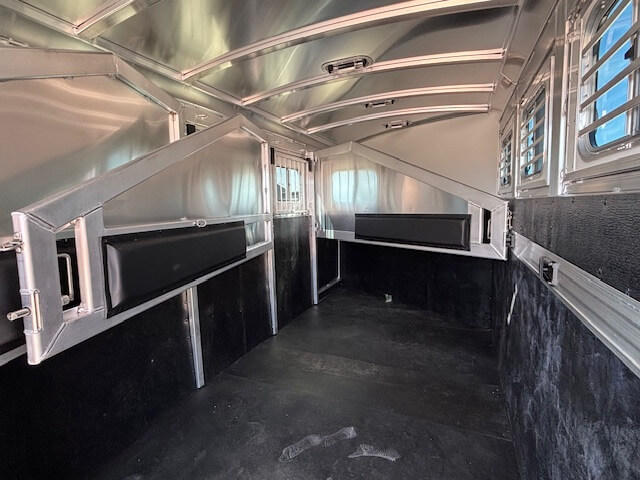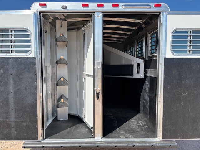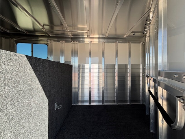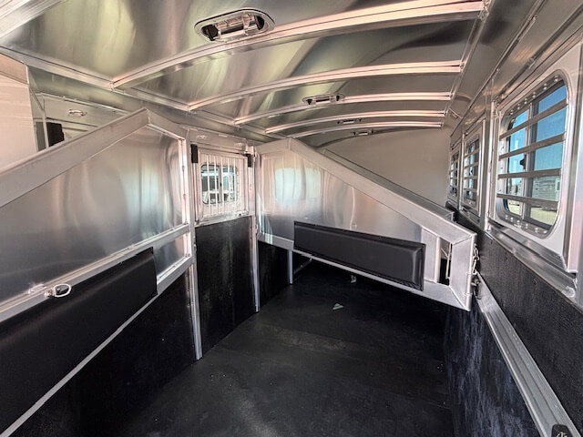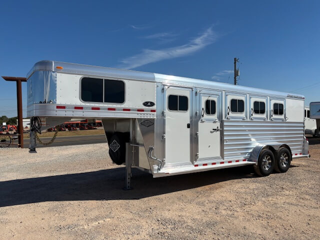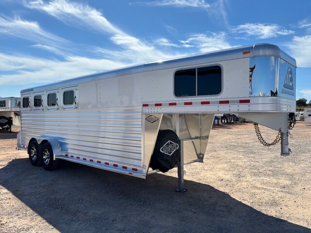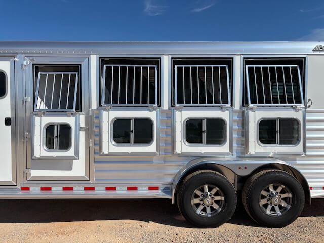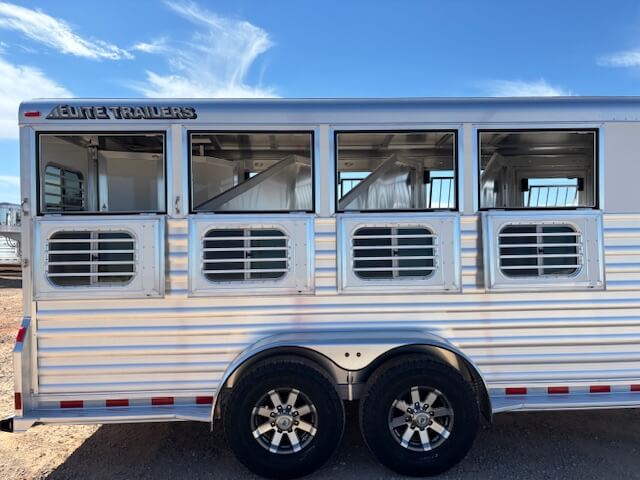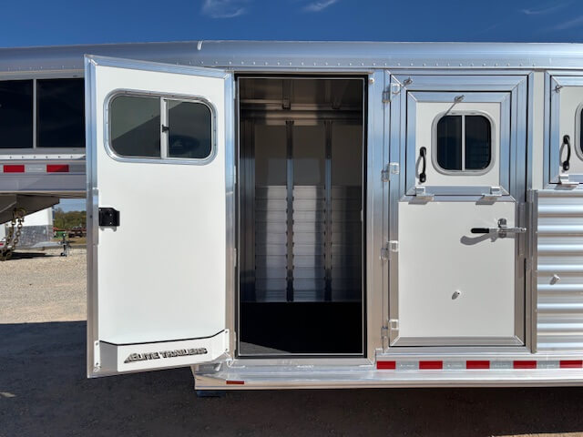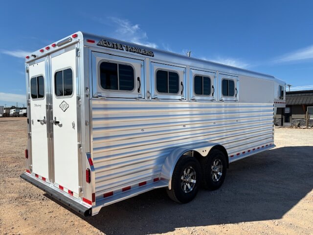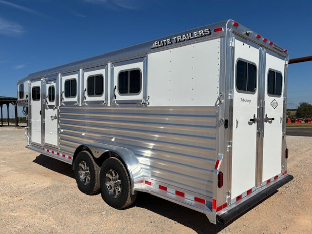 #23418 7x21x7 Tall. 2026 Elite 4 Horse Mustang. Dressing Room with Blanket Bars & Bridle Hooks, Collapsible Rear Tack, Rubber Lined Horse Area, Drop Windows on Both Sides, Escape Door, Aluminum Wheels, Spare Tire...