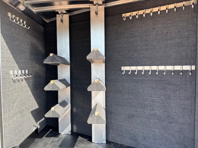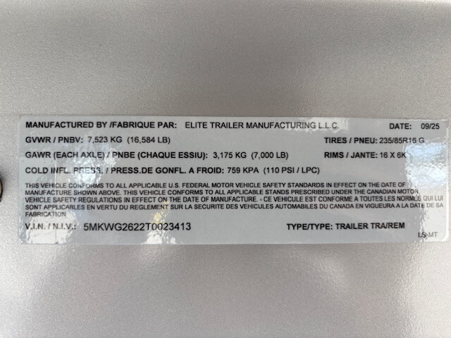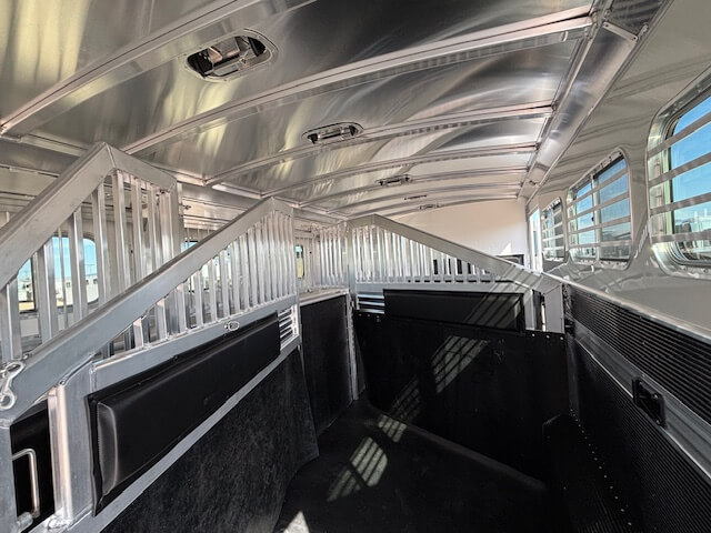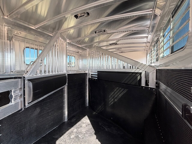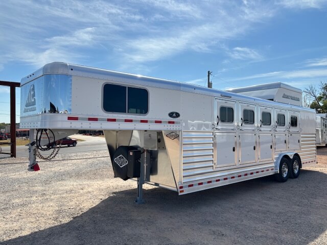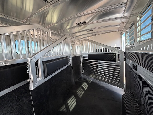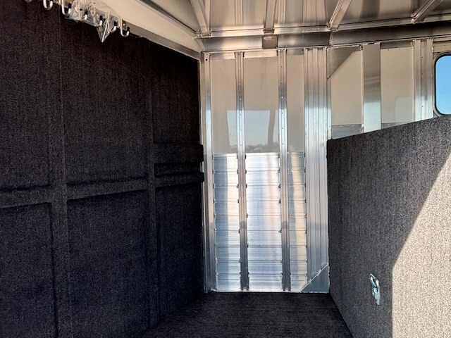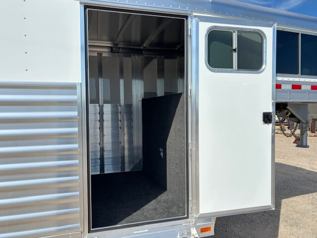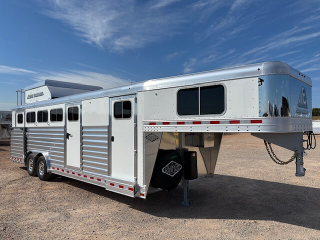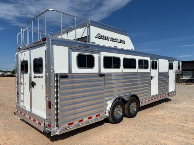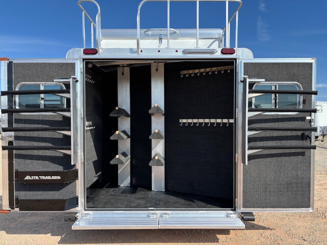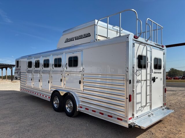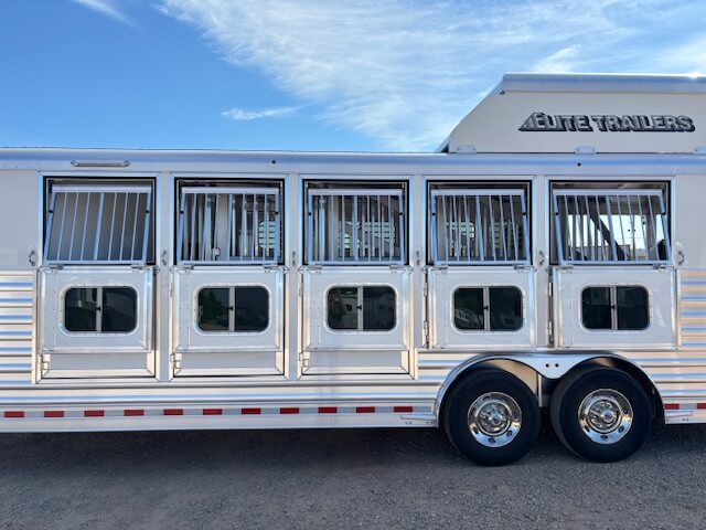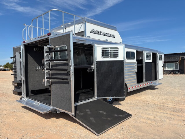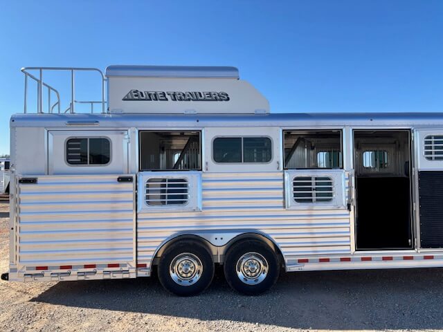 #23413 8x26x7' Tall. 2026 Elite 5 Horse Side Load. Front Dressing Room with Clothes Rod and Carpeted Wall, Full Back Tack with Six Saddle Racks, Double Swing Out Blanket Bars, Extra Bridle Hooks, Extra Brush Boxes, Side Ramp, Stud Divider, Two Dividers with Rubber, Mangers, Drop Windows on the Head Side with Fold Down Bars, Escape Door, Hay Pod with Ladder, Hydraulic Jack, Spare Tire..