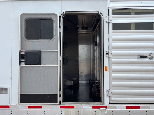 #64050 8x37x7.5' Tall. 2015 Exiss Stock Combo 10' Living Quarters. Full Kitchen, Fold Out Sofa, Full Bathroom with Walk Thru Door, GENERATOR (1171 Hours) Mid Tack with Saddle Racks and Extra Bridle Hooks, 20' Stock Area, Four Dividers + One Stud Divider, Full Swing Rear Door with Slider, Hay Rack & Ladder, Dual Hydraulic Jacks, Spare Tire...