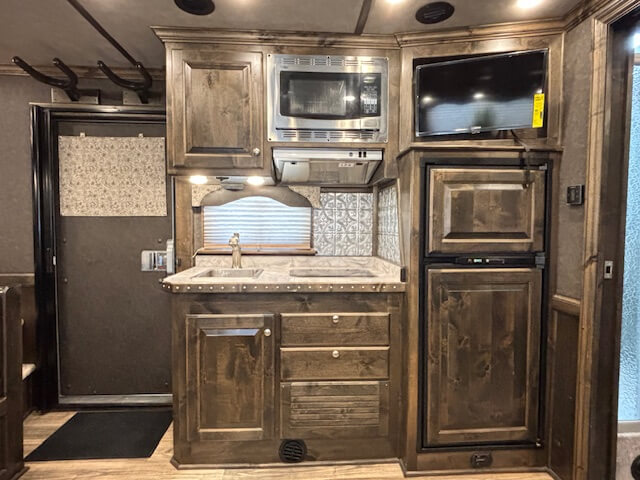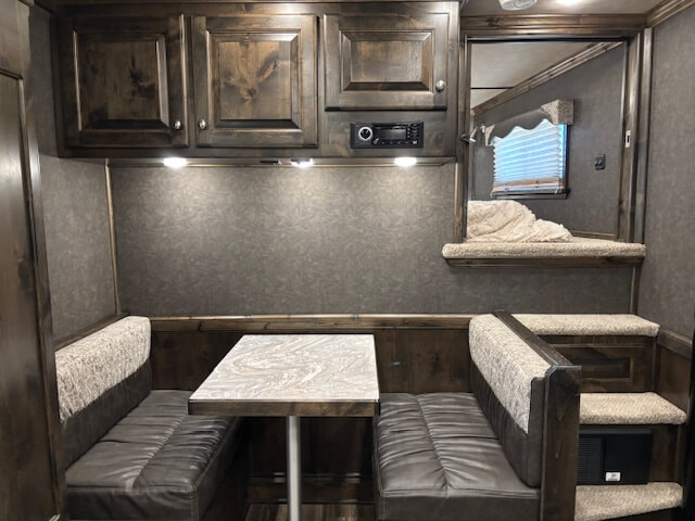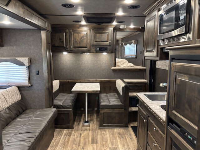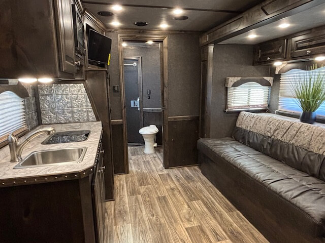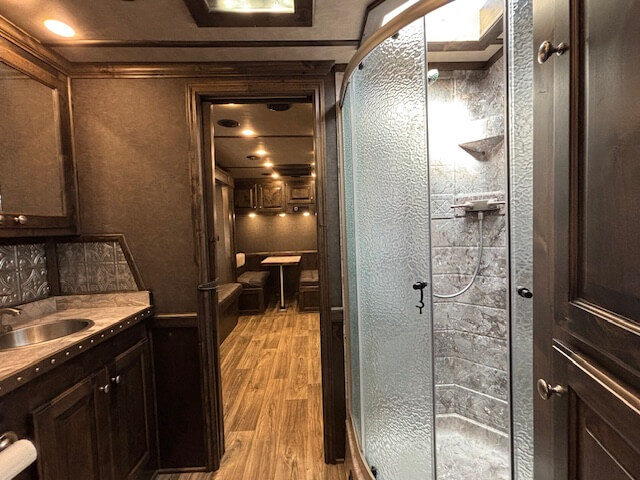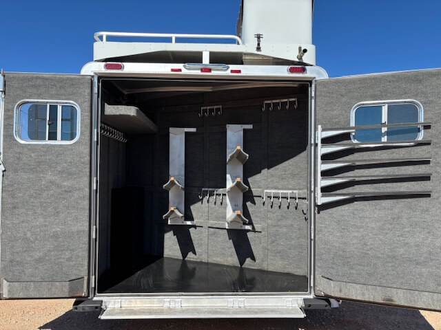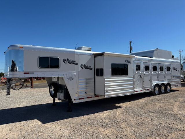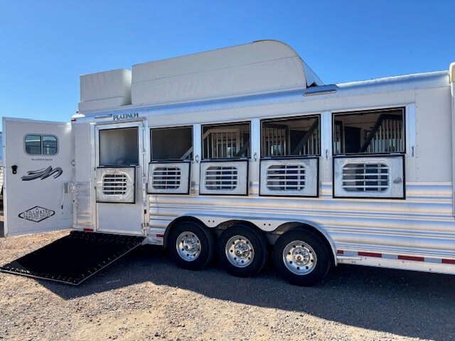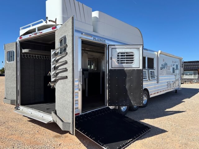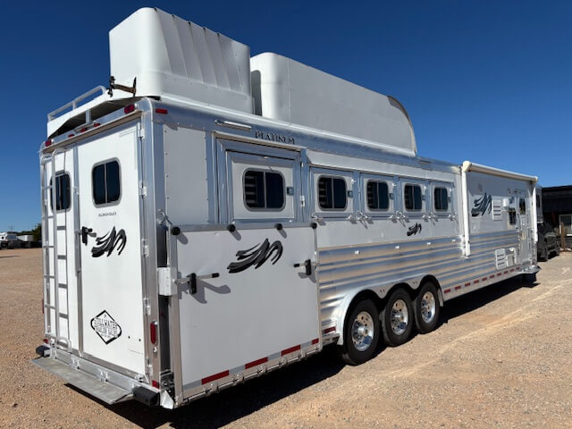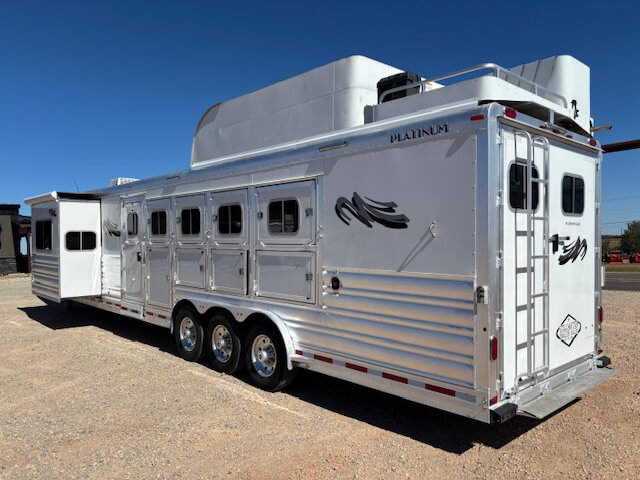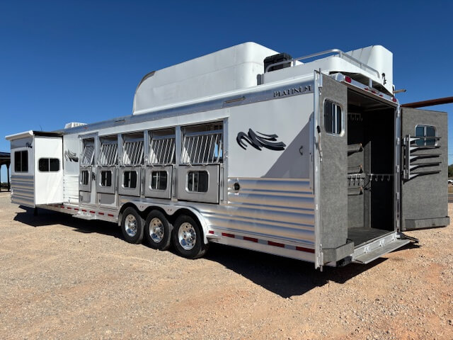 #11017 8x37x7.5 Tall. 2022 Platinum 5 Horse Side Load 14' Outback Conversion with Slide Out. Couch in Slide, Dinette on Drop Wall, Full Kitchen, 6.0 Fridge, Full Bathroom with Large Closet, Walk Thru Door, Hay Pod, GENERATOR, Full Back Tack, Side Ramp, Drop Windows on Both Sides, Mangers, Stud Divider, Insulated Horse Area, Equiflex Floor, Three 8k Axles, 17.5 Tires/Wheels, Power Awning, Dual Hydraulic Jacks, Spare Tire...