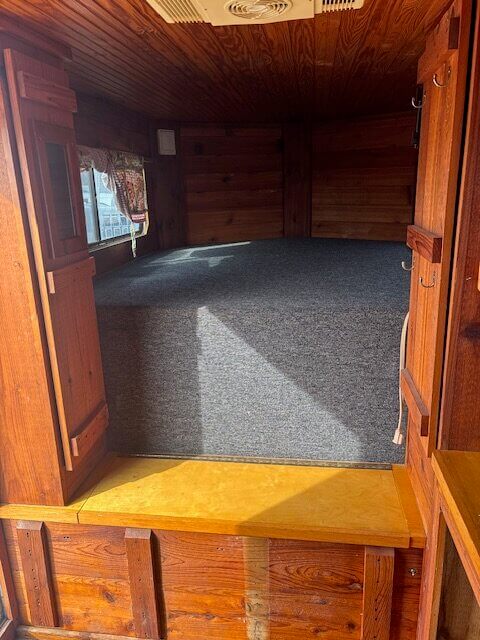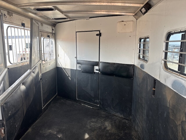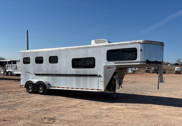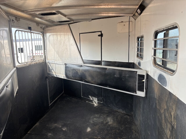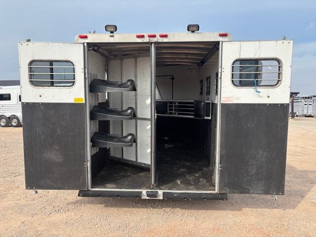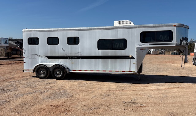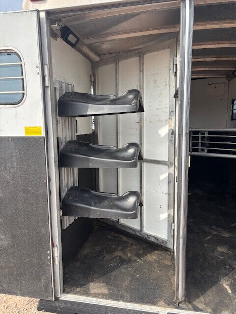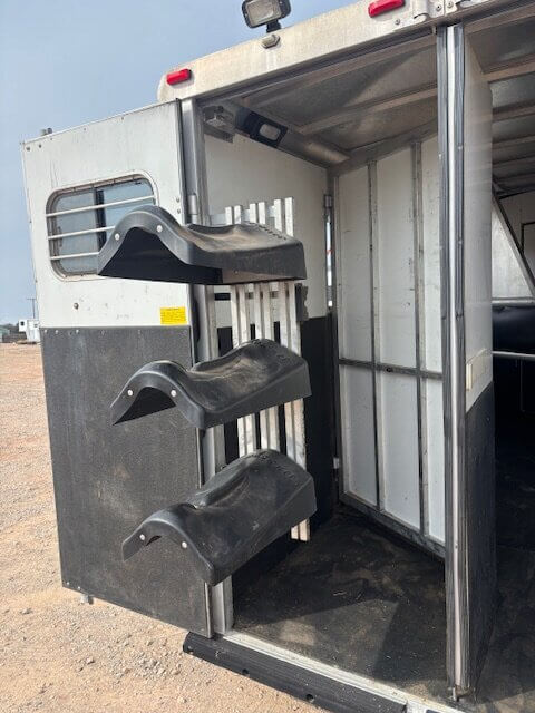 #A8100 7x18x7' Tall. 1999 Sundowner 3 Horse Trailer. Insulated Dressing Room with Partial Cabinets. Fold Up Rear Tack with Swing Out Saddle Racks, Rubber Lined Horse Area, Escape Door, Drop Windows with Bars on the Head Side, Spare Tire...