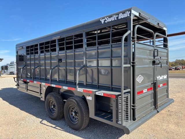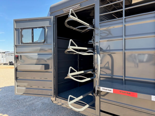 #28576 6.5x20x7 Tall. 2026 Swift Built Stock Combo. 4" Front Tack with Swing Out Saddle Racks, Blanket Bars Bridle Hooks, Equiflex Floors in Tack, Smooth Lifetime Rubber Floors in Stock Area, Center Gate, Escape Gate, Butterfly Rear Doors, Clean Out Gap, Easy Lock Coupler, Spare Tire...