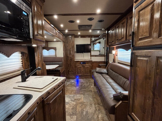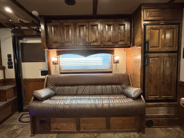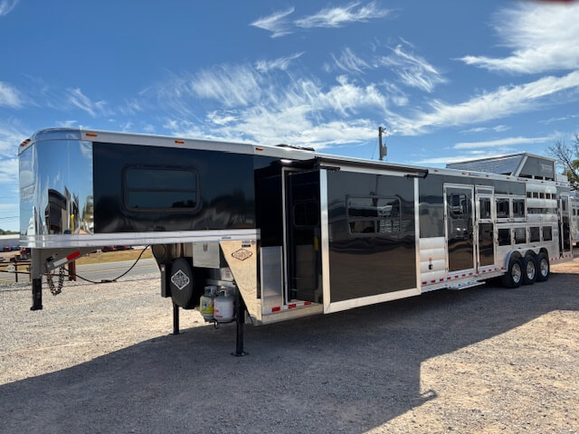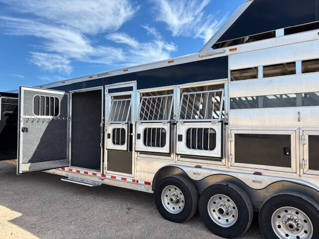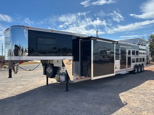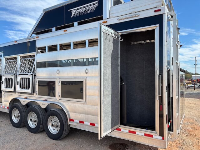 #33340 8x41x8 Tall. 2022 Twister 6 Horse 15'6 Outlaw with Slide Out and Double Door Mid Tack. Couch with Bunk Overhead, Dinette, Full Kitchen, 6.0 Fridge, Entertainment Center w/ Counter, Full Bathroom with Walk Thru to Mid Tack, Mid Tack with Saddle Racks on Both Sides, Extra Blanket Bars and Bridle Hooks, Broom Closet, Mangers, Three Drop Windows, Plexiglass, Hay Pod, NEW GENERATOR (6 Hours), Rear Ramp, Three 8k Axles, Elec/Hydraulic Brakes, Dual Hydraulic Jacks, Spare Tire...